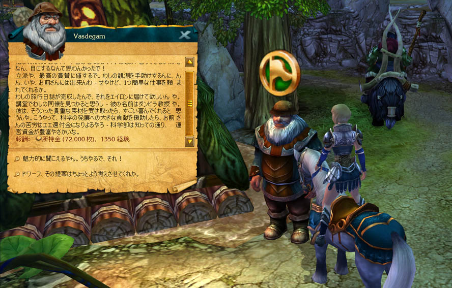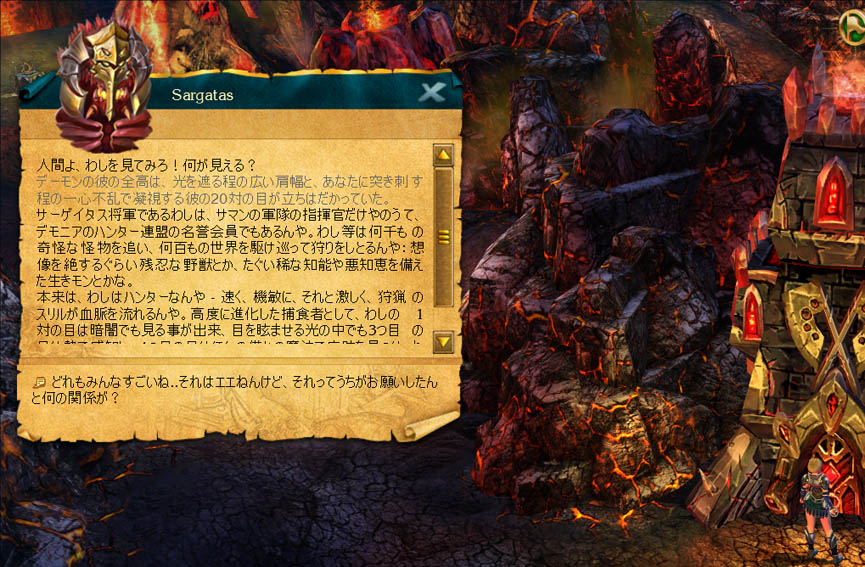 クリアするまでに何度も会話の選択を迫られる このタイプのゲームはじっくり本編を楽しみながらクリアしたいもの なので翻訳をしてみるか・・となったわけだけど なかなかどうして見ちゃいけないところまでも見てしまわないと 翻訳作業にならないものだから 会話の選択肢をすべて翻訳で読んでしまっているため どの応対を選べば得をするのかが分かってしまう また自分の誤訳で思わずポカをやってしまう事もあるw もちろん ポカをやってしまったと分かっているからやり直したりするんだけど・・ 今回エイロンの地では 重要・・・かどうかは別として たった一つの選択肢が後々にまで影響を及ぼす(・・のか?)ものが出て来た それを試してみたいところだが 相手が「無敵」とあっちゃあ敵わない^^; 間もなくエイロンの国王、女王のチャットログも完成し 進捗も200/375ファイルとなりかけてます アップもしばらく様子見なので ゲームの進行も少し頑張るか とりあえず今だほったからかしの「話す蜘蛛」を倒しにいくか・・・ |