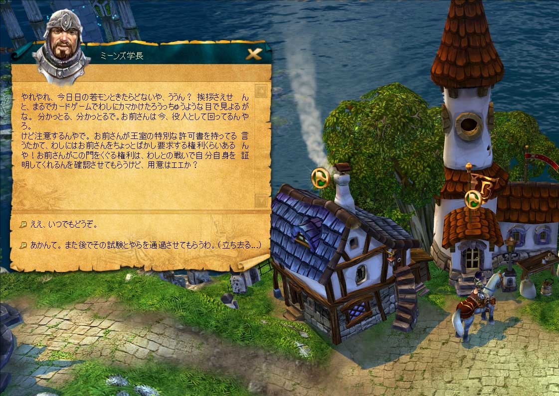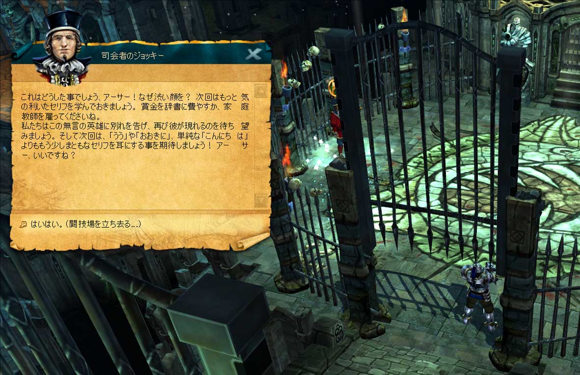 長い長い司会者の会話を泣きながら完成させ 一応ここにアップのご報告です^^; しかしながら 会話の順が分からずに意味不な状態がありますので ゲームプレーしながら最終検修を行っております 現在まだ蜘蛛倒したところですが・・・・・・ 分からんながらの翻訳作業でしたが 司会者が順序立てて話してくれると なるほど ちょっぴり面白いやん、このおっさん 司会者だけは関西弁するとより複雑になるため 標準語・・・もどきでさせていただきました^^; さぁ、いよいよちょっと拍子抜けした最後のキャンペーン 『オークの行進』ですね! 使い回しのデビル島ですが ぼちぼち進めていきましょうかっと・・ マクガード一族のギルド ようやく日の目を見れて ちょっときれいな画像に安ど感 トリスタン こちらも見慣れた風景で落ち着きます 高価な騎士なども居ますがお金が足りません>< どうやって相手のHPを見るんだろうと 最初分かりませんでしたが ちゃんとカーソル合わせると 訳した怪物データもしっかり見れました! シャイなアーサーをいぢめる司会者ジョッキー こんな口調が最後まで続くとはな・・・ KBAPC 日本語化データ:Ver0.7 |