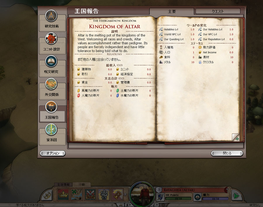 2chの方で2度ほどファイルがアップロードされており そちらのファイルと見比べてみても こちらのが僅かながら進んでいましたので 一部一部をピックアップさせていただきました (無断ですみません^^;) またxmlファイルについては 君主の背景などが日本語編集しても文字化けするなど 安定していない為、今回はアップを見送りました とりあえずは 「elemental.str」ファイルを進めて行こうかと思っております ゲーム上、すぐに編集できそうなxmlファイルはいじっているのですが プロジェクトがあちらこちらで乱発しそうな雰囲気ですので 少し間様子を見ようかと思っております 全て「elemental.str」に出て来たワードではなく xmlファイルの 「CoreResources.xml」を編集しないと ここまで日本語表示出来ません なかなか絡みが複雑なので 一括で作業できないところがまどろっこしいですね~ とりあえずは日本語化を未導入の方は 「elemental.str」ファイルだけ入れて様子を見られては? \Elemental War of Magic\data\English 直下に入れてください (オリジナルのバックアップは忘れずに!) xmlファイルを導入する場合、 \Elemental War of Magic\data 直下の「Data.zip」を「Data.org」などに名前を変え スタートメニューから「ファイル名を指定して実行」を選び 「インストールフォルダ(略)\Elemental.exe /createxmlbinary」と入力して実行し 「新規ゲーム」でプレーする必要があります。 少し間時間がかかりますがひたすら待機して下さい すると戦略マップが表示され、フォルダを確認すると 新しく「Data.zip」が作成され、導入したxmlファイルが有効になります 日本語化ファイル:elemental.str |