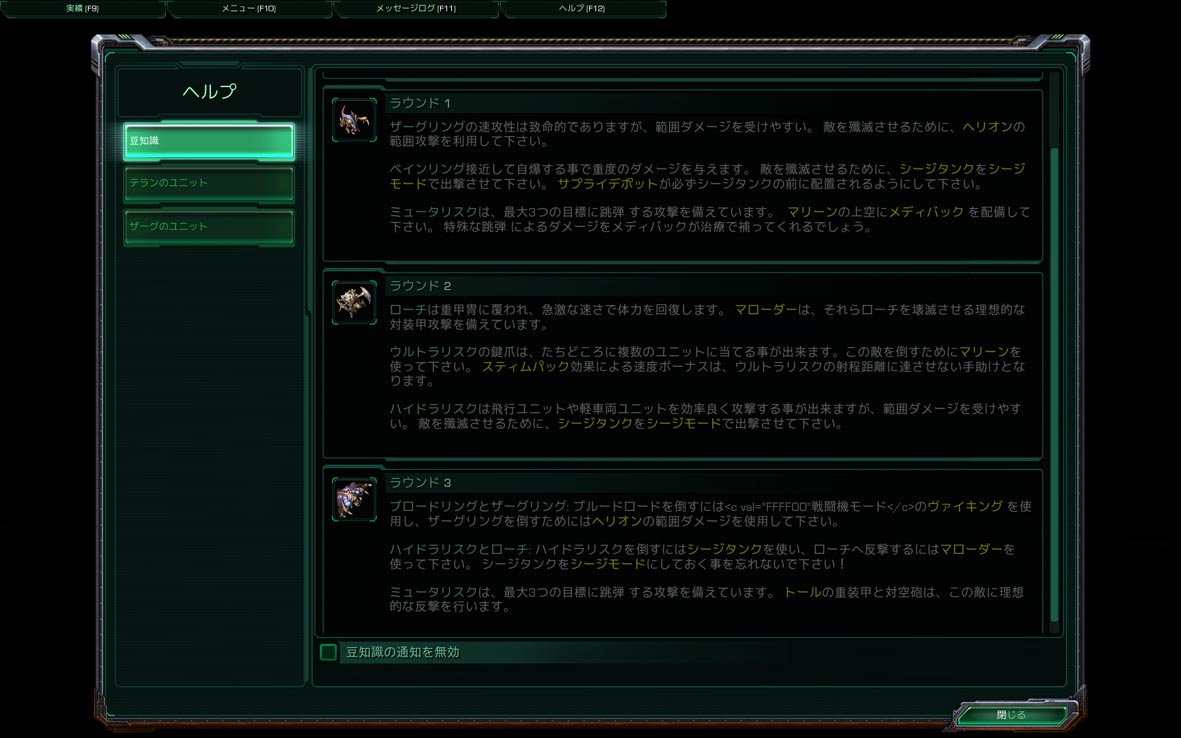 最期の検収も終了し それでもまだ未完ではありますがホットキーなど 最新ヴァージョン対応の日本語化Modが完成しました♪ テックツリーだけでしたが ユニットの説明も閲覧できるようになりました 今後wikiデータのように詳細データ満載に していく予定です まあ、新ヴァージョンらしくメニューに 「ホットキー」が入っている事で起動の確認^^; このホットキー定義画面の為に一部未着手のファイルを 編集する必要があったのを知るまで1週間かかりました・・ キャンペーンだけでなく、マルチプレイまですべてが日本語化されています また、ナビゲーションパネルの操作なども日本語表示になりましたので ロビー作成、友人登録なども分かりやすくなったのではないでしょうか・・? 最新版アップデートファイル: インストーラーや導入方法については過去記事参照 表記を直した 今までぼーっと見ていただけだったが こんな表記をしていたのねって 今更知ったw 改正版:scr.cab (2011.01.18 AM0:14) |