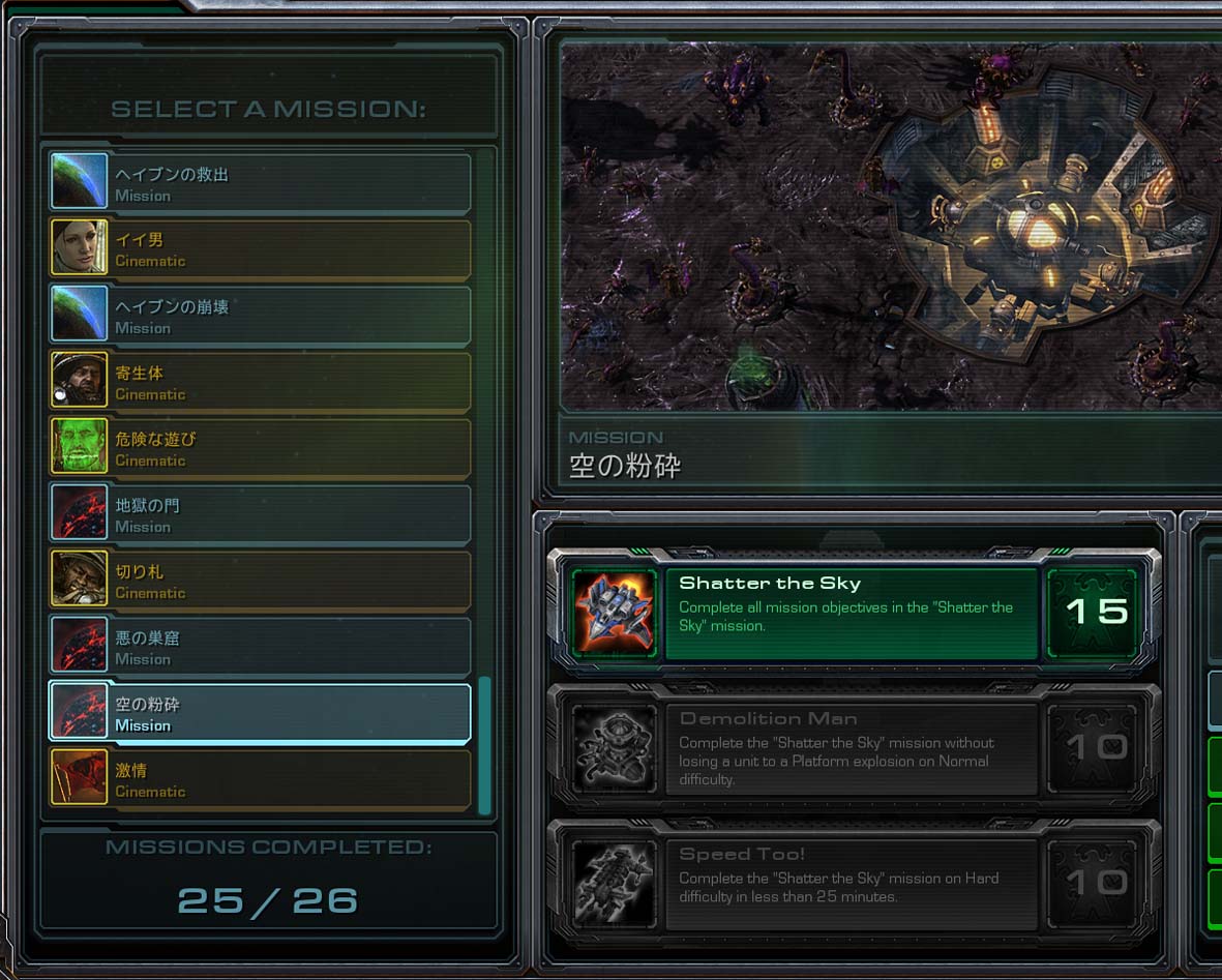キャンペーンの会話から アップグレードや傭兵 ヒントや研究日誌 そしてムービーとやる事は一杯だったが 充実した 問題は 未だにどうプログラムをしているのか 字幕が日本語にならないところ データに存在しない(ことはないんだろうけど)英語字幕が出て来るところが 多々あるということだ 解決の糸口が分かれば 画面内でポップアップされる名詞や、ヒントメッセージなど 全てを日本語化出来ると言うのに、これは残念 なによりムービーシーン、TVニュースはいまだお手上げ状態だということ 誤字脱字は直せてもこれだけはね~ あ・・あとステットマンの記録が表示されないのもいまだ放置だったなぁ・・・ 終わりが近づくほどにその未完成度さに苛立ちが隠せない タイトル付けは難しいね 最初は映画のタイトルが多かったので 楽勝やんって思っていたが あとは日本語に直すと 表現しにくい言葉ばかりだったもんなぁ~ 日本語化:Ver.0.9 |
